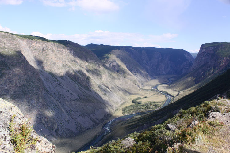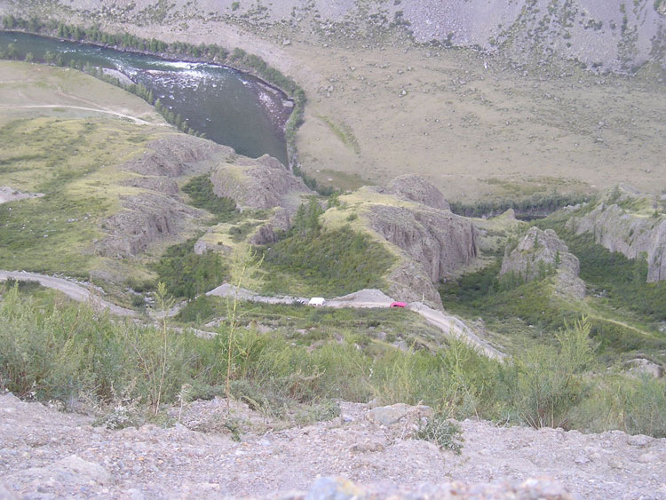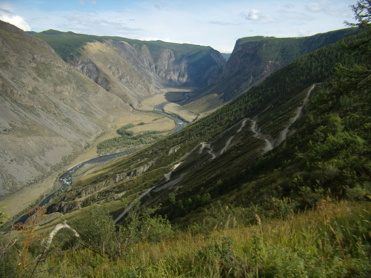 Дорога все уже, горы все круче, валуны все крупнее. Все говорит о том, что скоро за вершинами кедров откроется долина реки Чулышмана. Последний крутой спуск и мы оказываемся на горной террасе, откуда открывается изумительный вид на реку, с ревом несущую свои бирюзовые воды в глубоком каньоне. Но что бы спуститься к реке, нужно преодолеть горный перевал Кату-Ярык, протяженность спуска по которому ни много ни мало три с лишним километра.