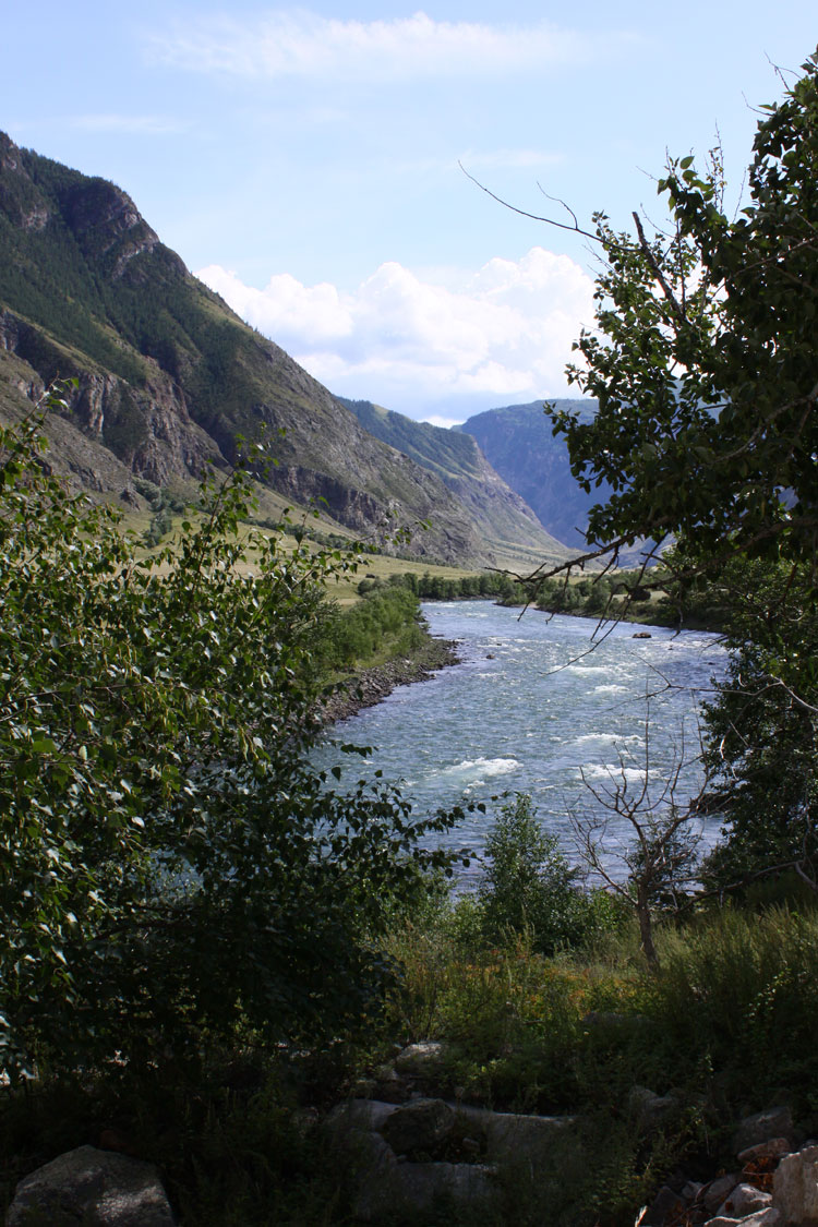 Все! Свистя тормозами, выезжаем на ровную дорогу, мы в каньоне Чулышмана. Лично для меня, это одно из самых красивых мест, которое я повидал за свою не обиженную путешествиями жизнь. Узкий, шириной не более километра каньон, по которому несет свои струи река, с обеих сторон, как тисками, сжат высокогорьем. Дорога всё время идет по левому берегу реки. Из окна автомобиля то и дело взгляд рыболова ловит места, где должен притаиться в засаде хариус или таймень.