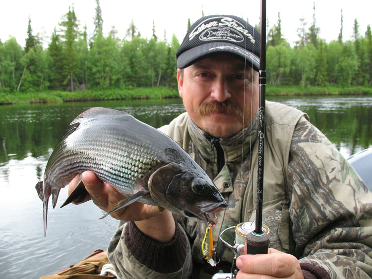 С хариусом дела обстояли получше, но было очень много мелочи. Ловля на вращающиеся приманки сводилась к многочисленным поклевкам и ловле рыбешек не представляющих спортивного интереса. Если поначалу это занятие было интересно, то потренировавшись на технике проводки и подсечки быстро наскучило. Хотелось трофеев и мы перешли на воблеры.