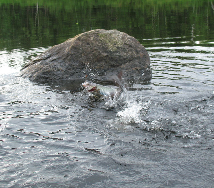 Размер круга, пущенного сигом, сулил встречу с приличным экземпляром. И рыбина попалась вполне трофейная. Спиннинг Extreme line согнутый до самого комля отрабатывал пируэты рыбы в воде. Главное что бы сиг глотнул воздуха, после этого он не боец. Но перед тем как сдаться, он еще потреплет нервы рыболову. Сиг, глубоко заглотавший приманку большая редкость. Чаще всего тройник висит на самом крае губы. Поклевка деликатная, по-видимому, атака направлена именно на муху.