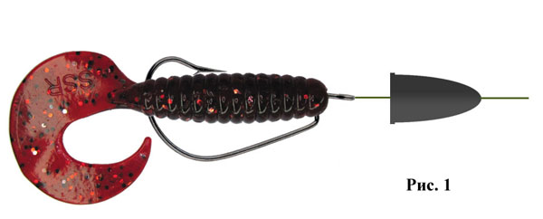В дальнейшем я убедился, что метод работает, жерех ловится исправно, а потому могу уже позволить себе дать некоторые советы. Сначала поговорим об оснастке, а если конкретнее – об оснастке техасской. Для ловли в траве, особенно в траве густой, – вещь просто незаменимая. Для ее изготовления вам понадобится собственно приманка – твистер либо виброхвост, офсетный крючок соответствующего приманке размера и пулеподобное грузило-головка со сквозным отверстием. Принцип монтажа показан на рис. 1.