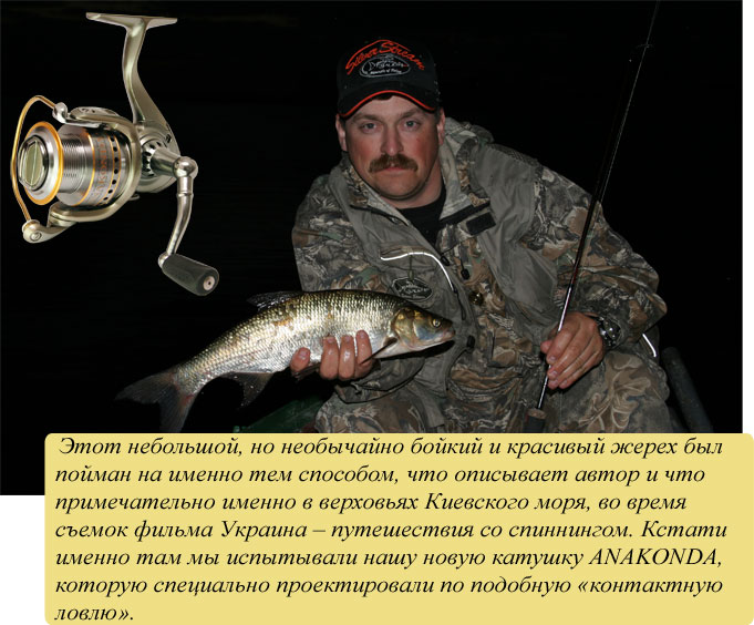 Начну, пожалуй, с истории вопроса. Несколько последних лет, выезжая порыбачить в любимые места в верховьях Киевского водохранилища, я наблюдал летом одну и ту же картину: какие-то крупные рыбины вовсю жировали в самой гуще травы, примыкающей к руслу. Четко разглядеть «пировавших» не удавалось, видны были только мощные буруны, но уже тогда возникло подозрение, что это именно жерех. Немного сбивали с толку рассказы товарищей о поимке в этих краях когда-то и как раз среди травы очень крупных язей. Сомнения практически исчезли, когда проводимый как-то у кромки травы стик-бэйт атаковала солидная рыбина, мощным ударом подкинув приманку метра на два в воздух. Я убедился, что у кромки гуляет именно жерех, небольшие сомнения оставались по поводу того, он ли это «ворочается» в самой гуще. Уж слишком необычным мне это казалось.