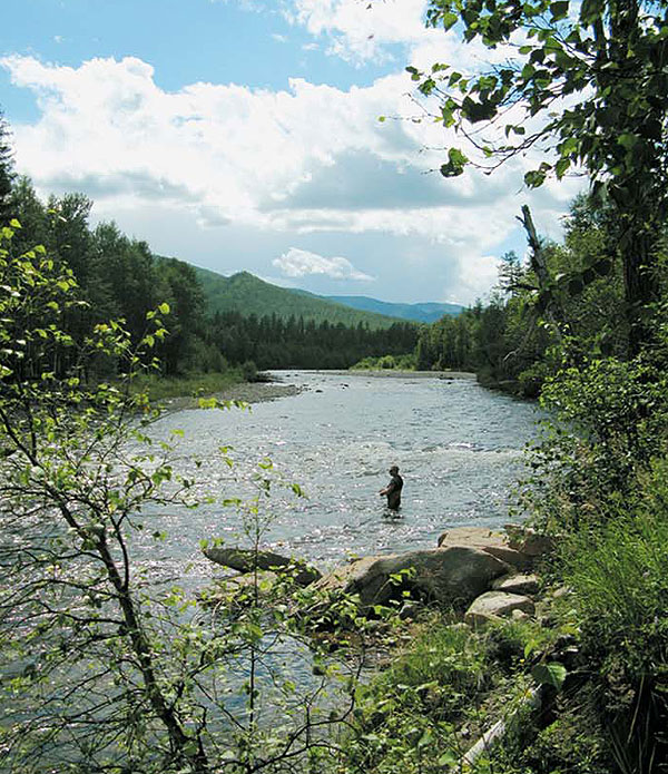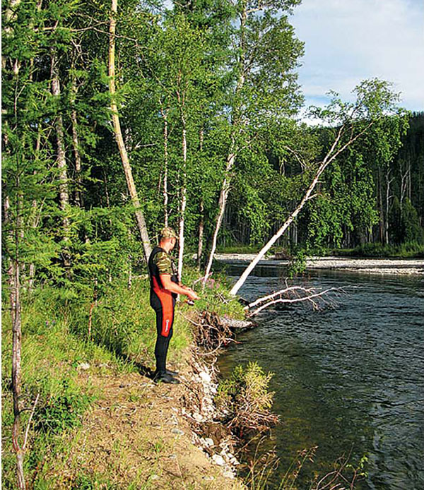 придавали особый колорит скудному туристическому рациону. 30 июля большая часть группы, заисключением заболевших и страстных рыболовов, ушла в трехдневный походвосхождение на г.Ханула - самую высокую вершину хребта Хамар-Дабан-2371 м. В верховьях искупались в красивейшем озере с изумрудной водой, полюбовались каскадом водопадов, бескрайними хребтами Хамар-Дабана. Вернулись уставшие, но довольные. Пойман первый ленок. Красавец! Серж не сразу понял, что клюнула хорошая рыба — удар, и все. И тут рыба разворачивается и начинает уходить. Визжит фрикцион, летят брызги! Постепенно сопротивление ослабевает. Чтобы как-то вывести рыбу на обрывистый каменистый берег, пришлось зайти в воду мне и, за неимением подсака, руками выбросить уставшего ленка на берег. В брюхе обнаружили мышку, кузнечиков, гусениц и больших муравьев. Отметили закономерность — ленок стоит на замедляющейся струе, слегка даже коричневатой. Хариус — на струе, особенно, если