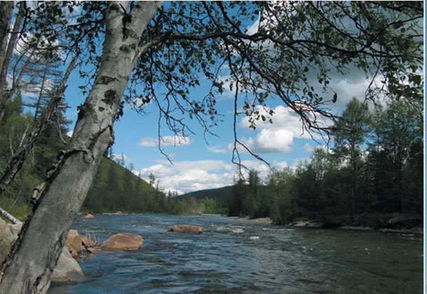 как-то смягчить лобовой удар. Почему в такой момент молчал капитан, никак не координируя действия команды, так и осталось загадкой. Чудом не сложился катамаран, чудом не размазало нас о скалу, чудом все остались на своих местах...На следующий день выглянуло долгожданное солнышко. Поднялось настроение. Помылись, постирались, посушились. Мы с мужем отправились вверх по Снежной на рыбалку, что оказалось не так просто. Идти вдоль реки не получалось - отвесные скалы сменялись сыпухой, и все это обходя, приходилось продираться сквозь непроходимый бурелом тайги и неустанно следить затем, чтобы не зацепить и не сломать спиннинг. Очень актуальным в такой ситуации оказался бы быстро складывающийся телескопический спиннинг, но об этом следовало бы подумать еще в Киеве... Выбившись из сил, добрались до первого островка. Рыба не ловится, настроение — никакое. В конце островка появились первые поклевки — ленок, за ним хариус, еще один хариус. Жизнь наладилась, и усталость как рукой сняло! Перебрели на следующий остров. Рыбалка становилась все интереснее. Забросы делаем прямо на плес, где в стороне от